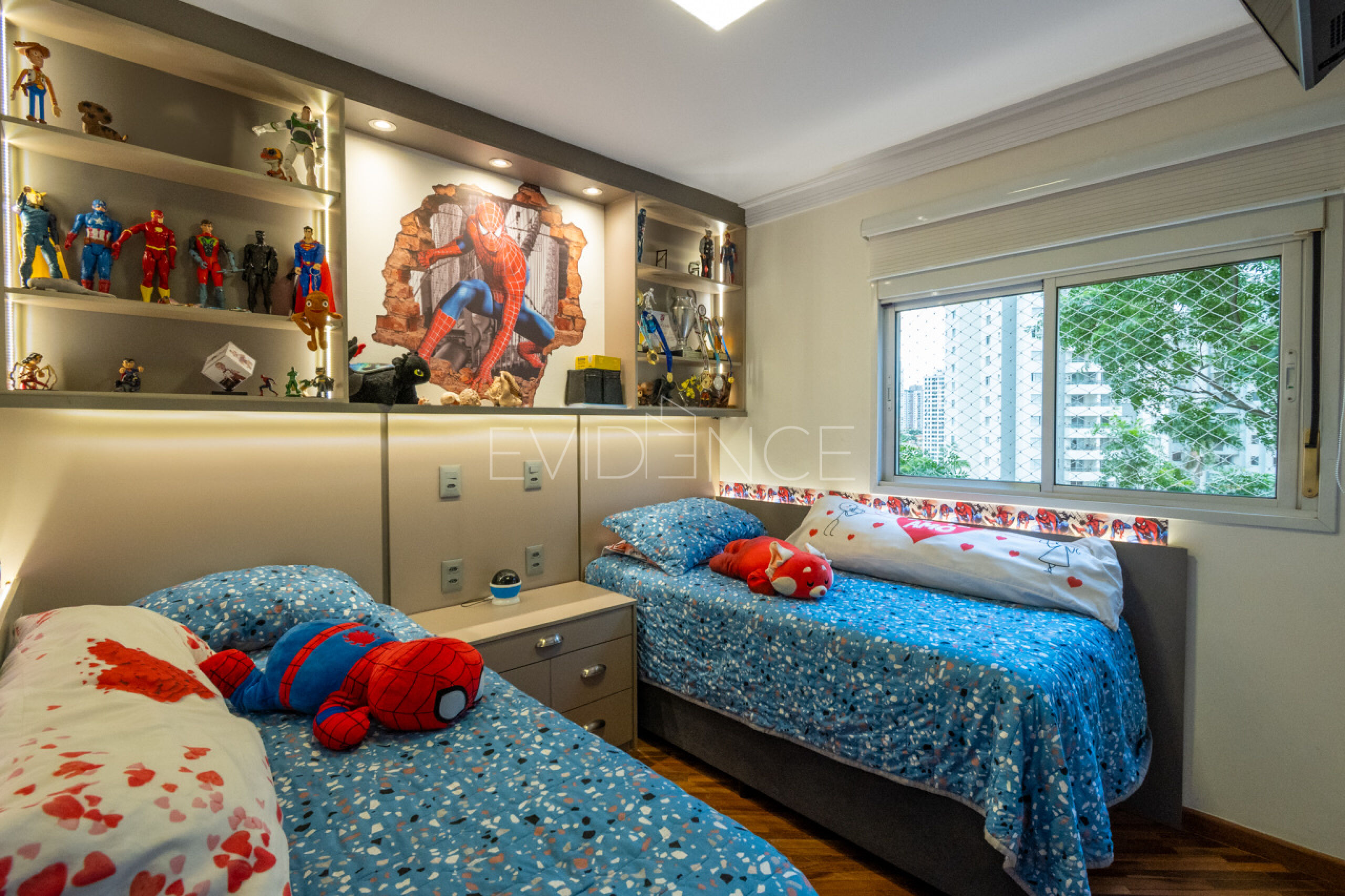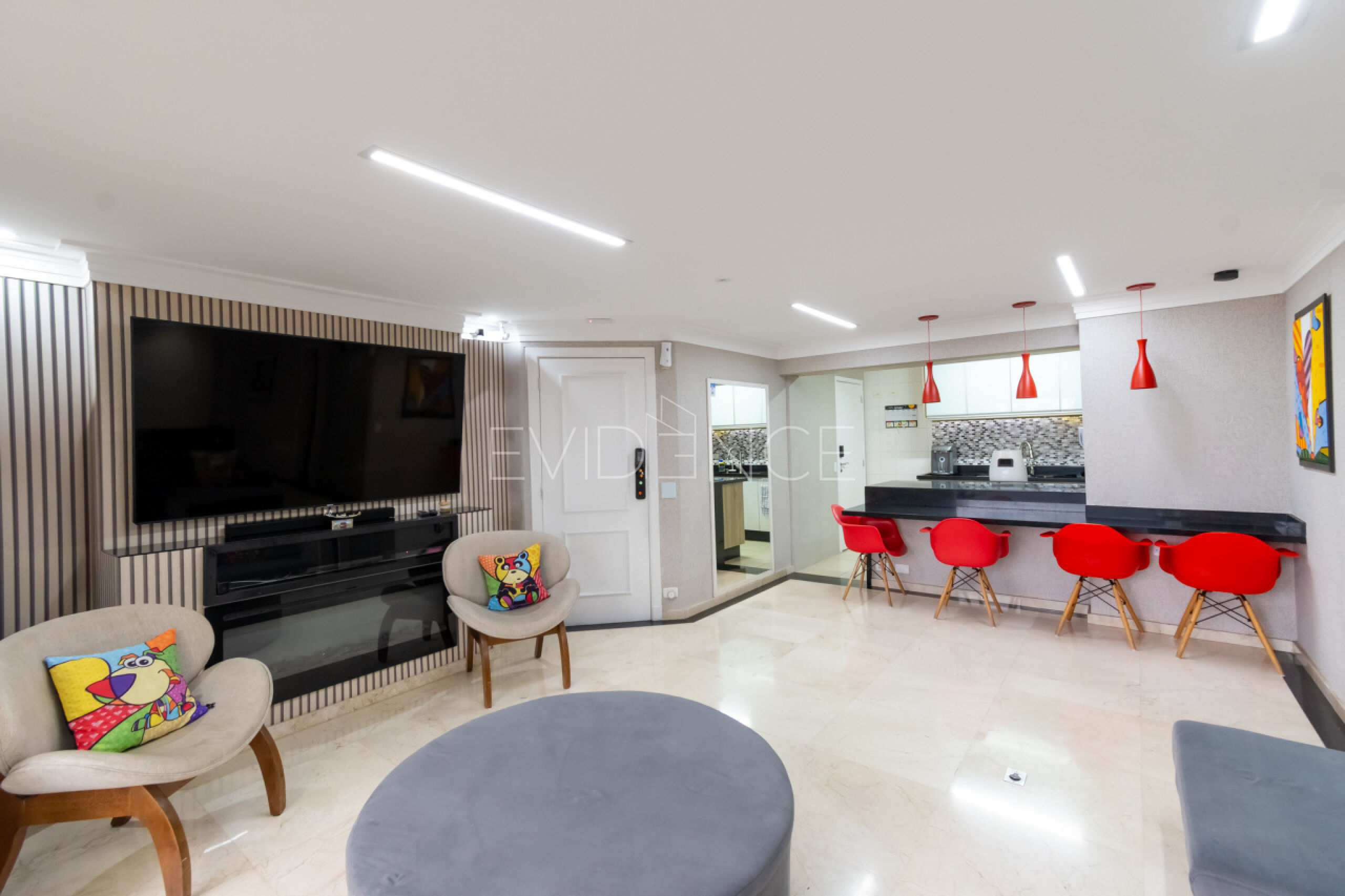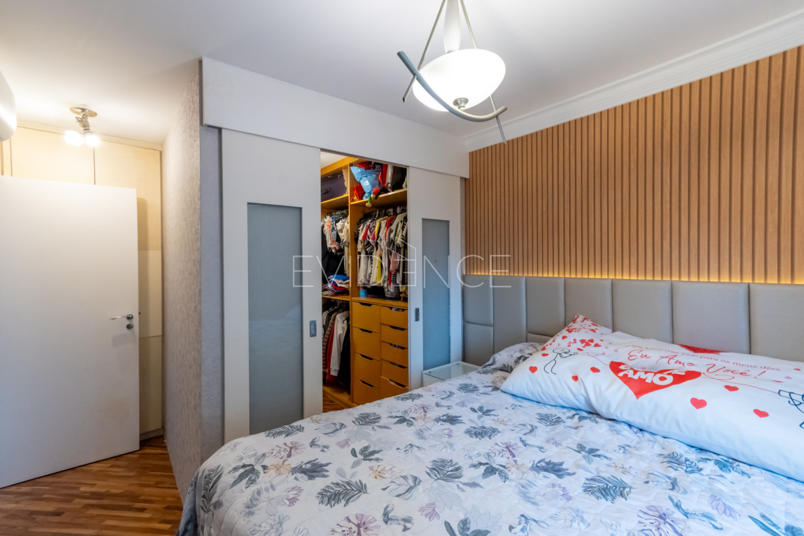 O apartamento tem acabamento de muito bom gosto com armários planejados, iluminação e decoração.