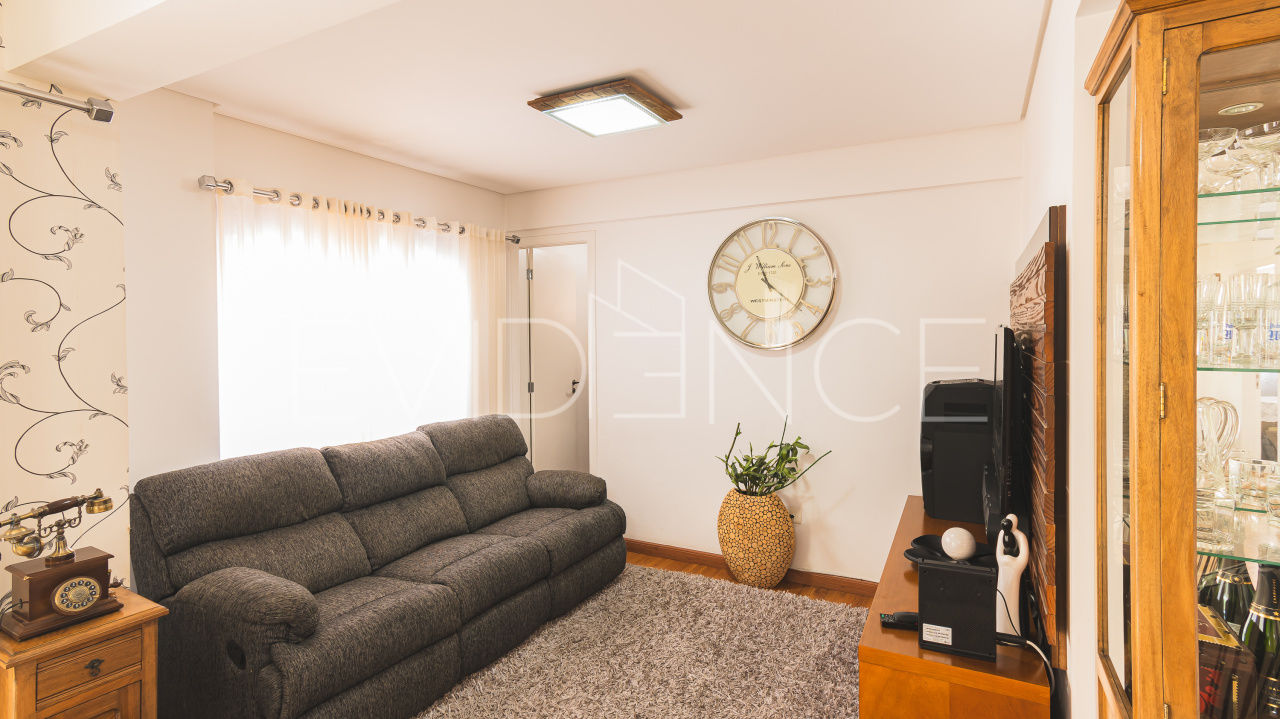 A sala é totalmente integrada à varanda (toda fechada em vidro), que ainda conta com churrasqueira à carvão.