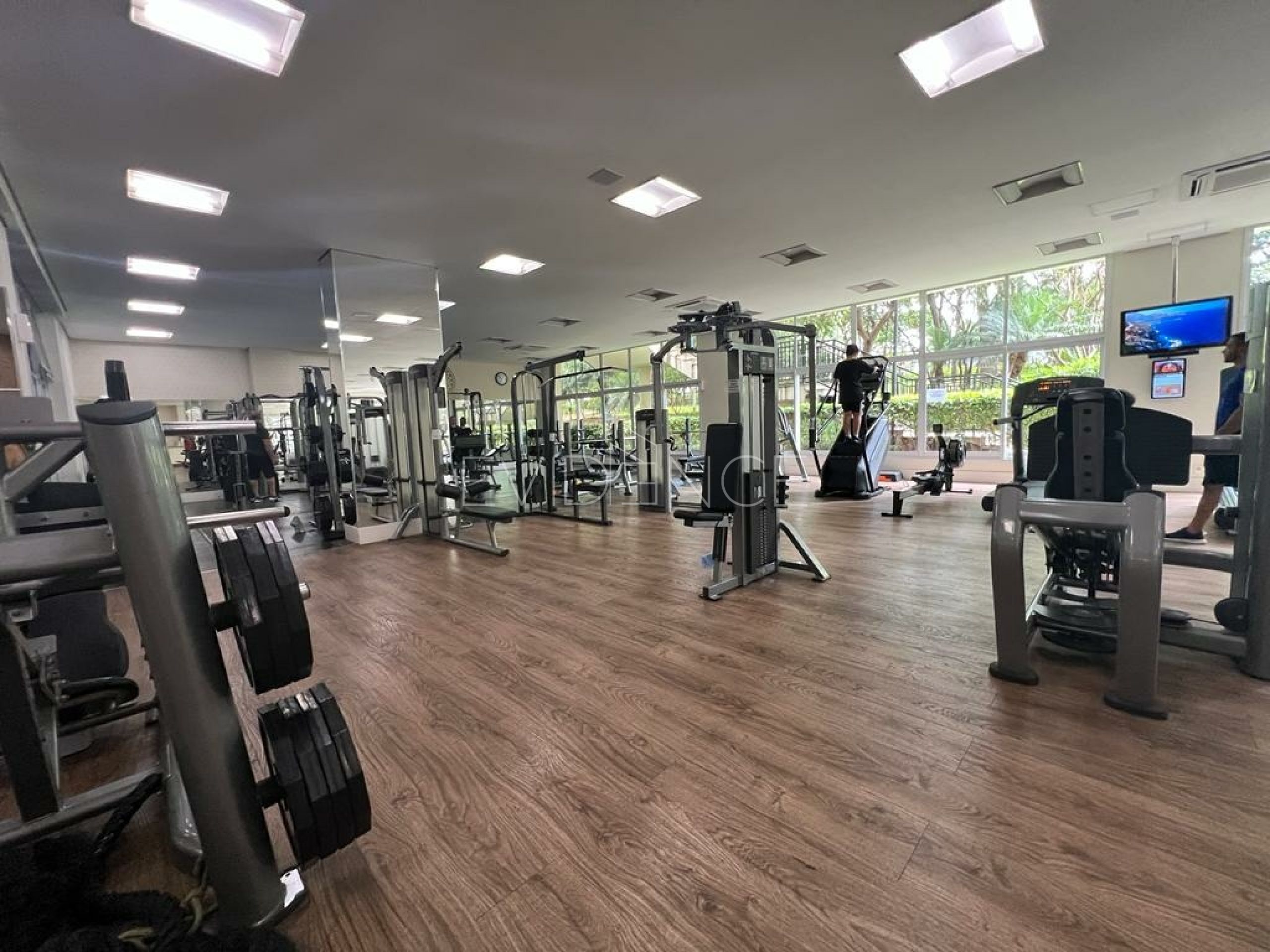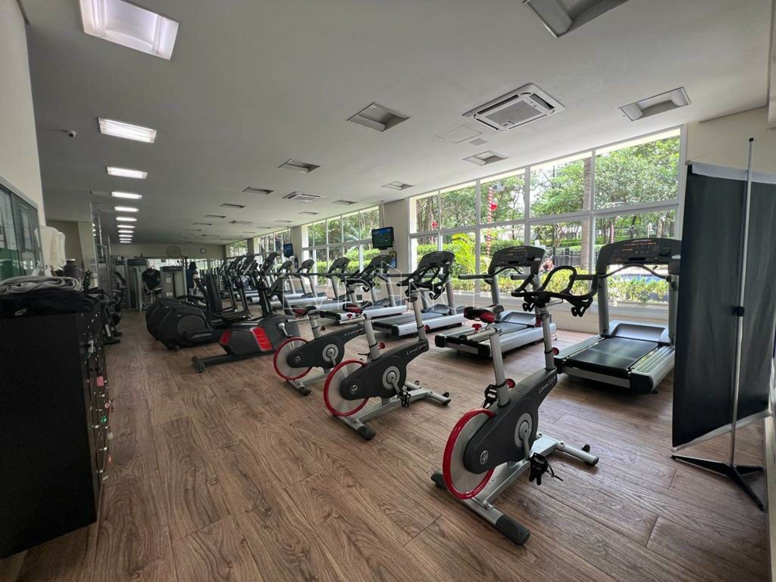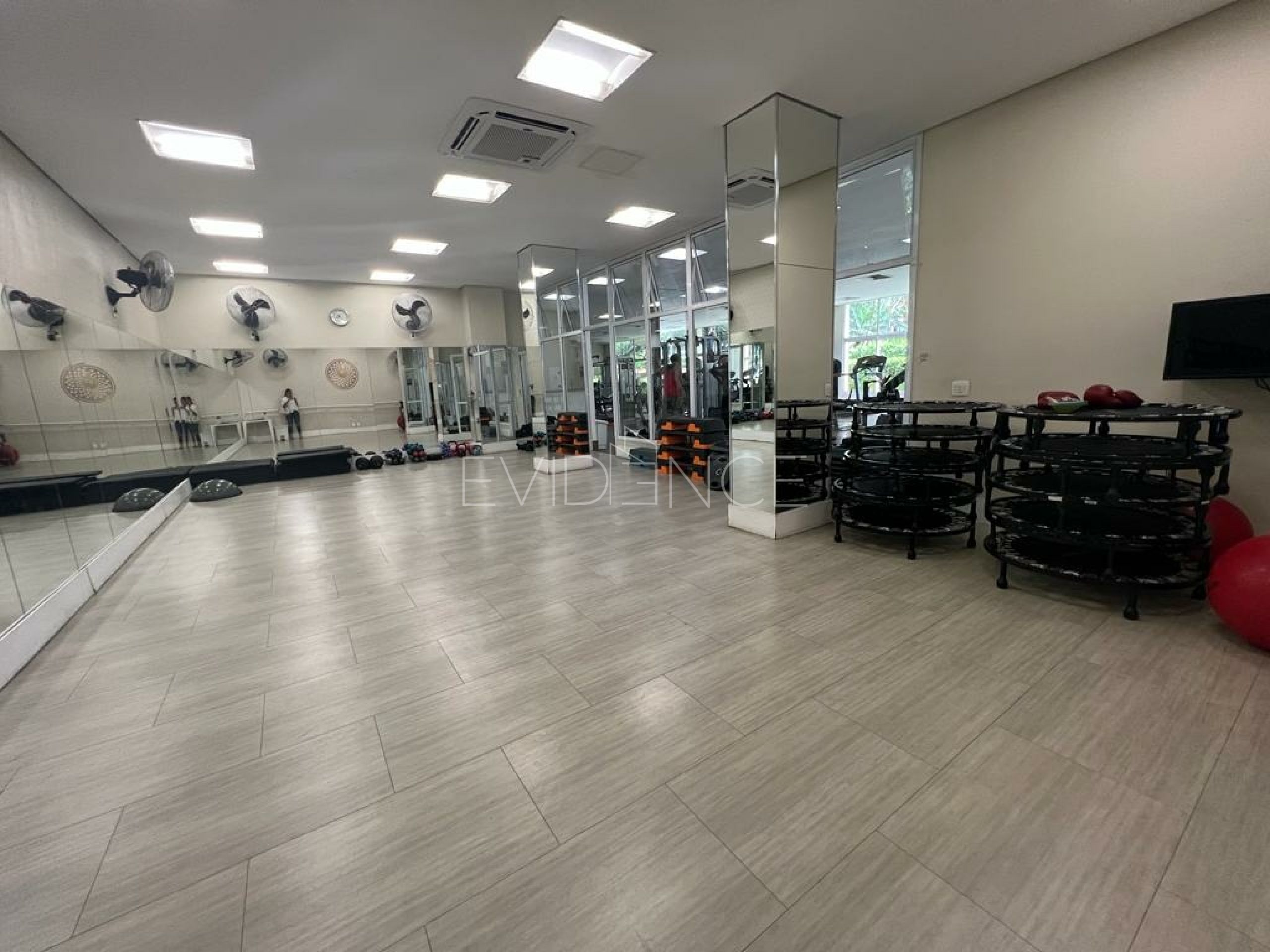 Academia com enorme sala de musculação, sala de ginástica e sala de bike