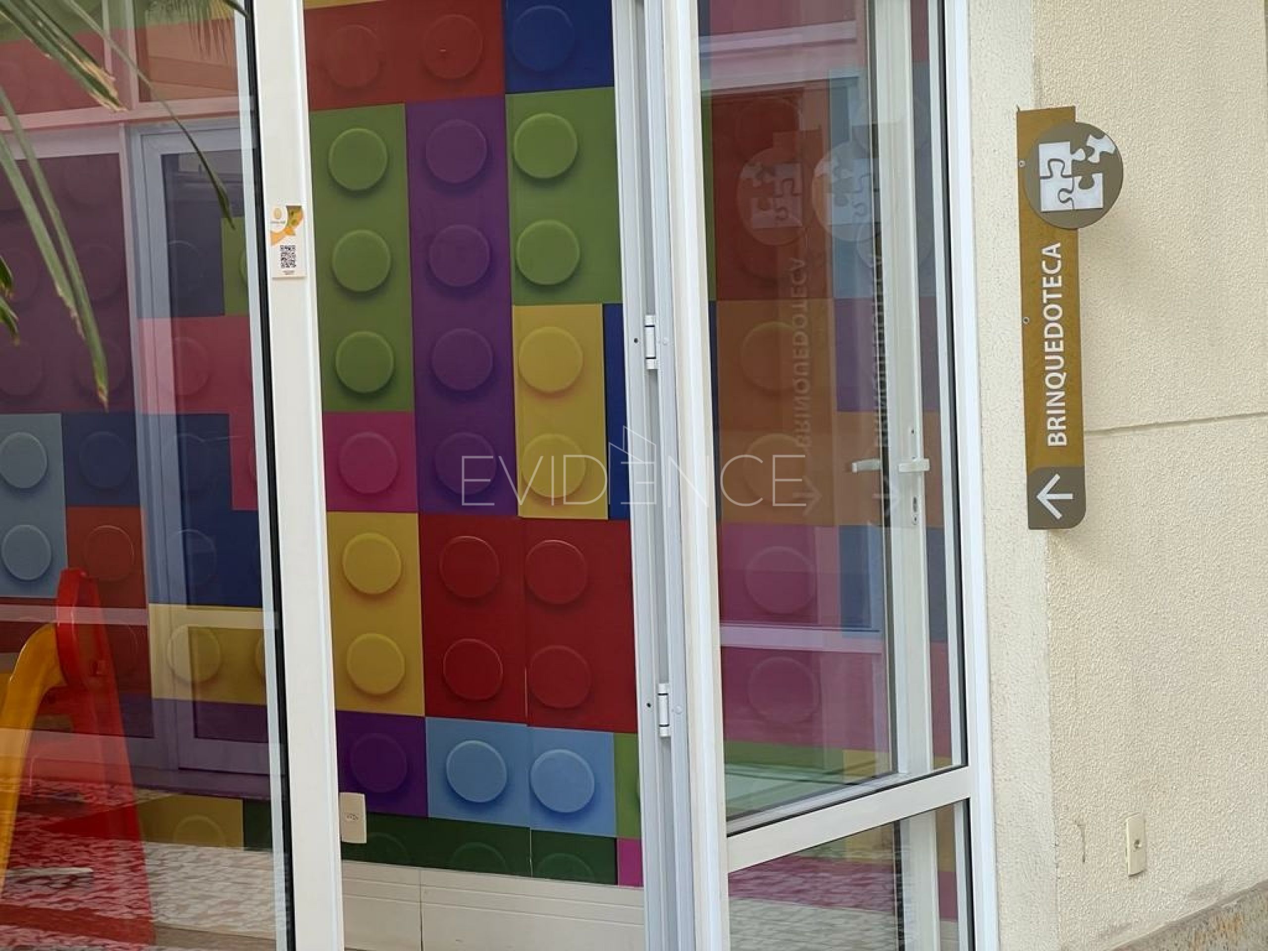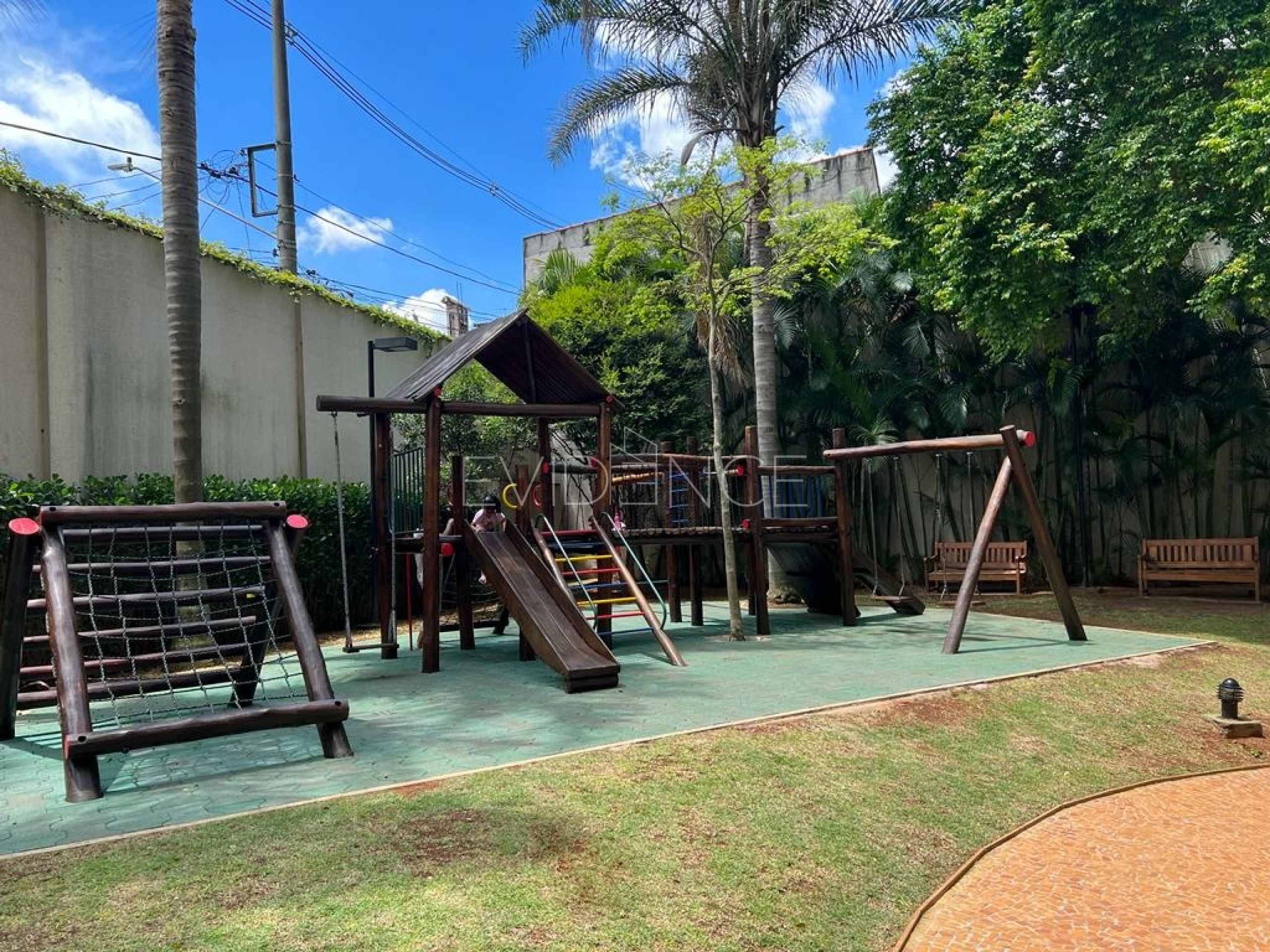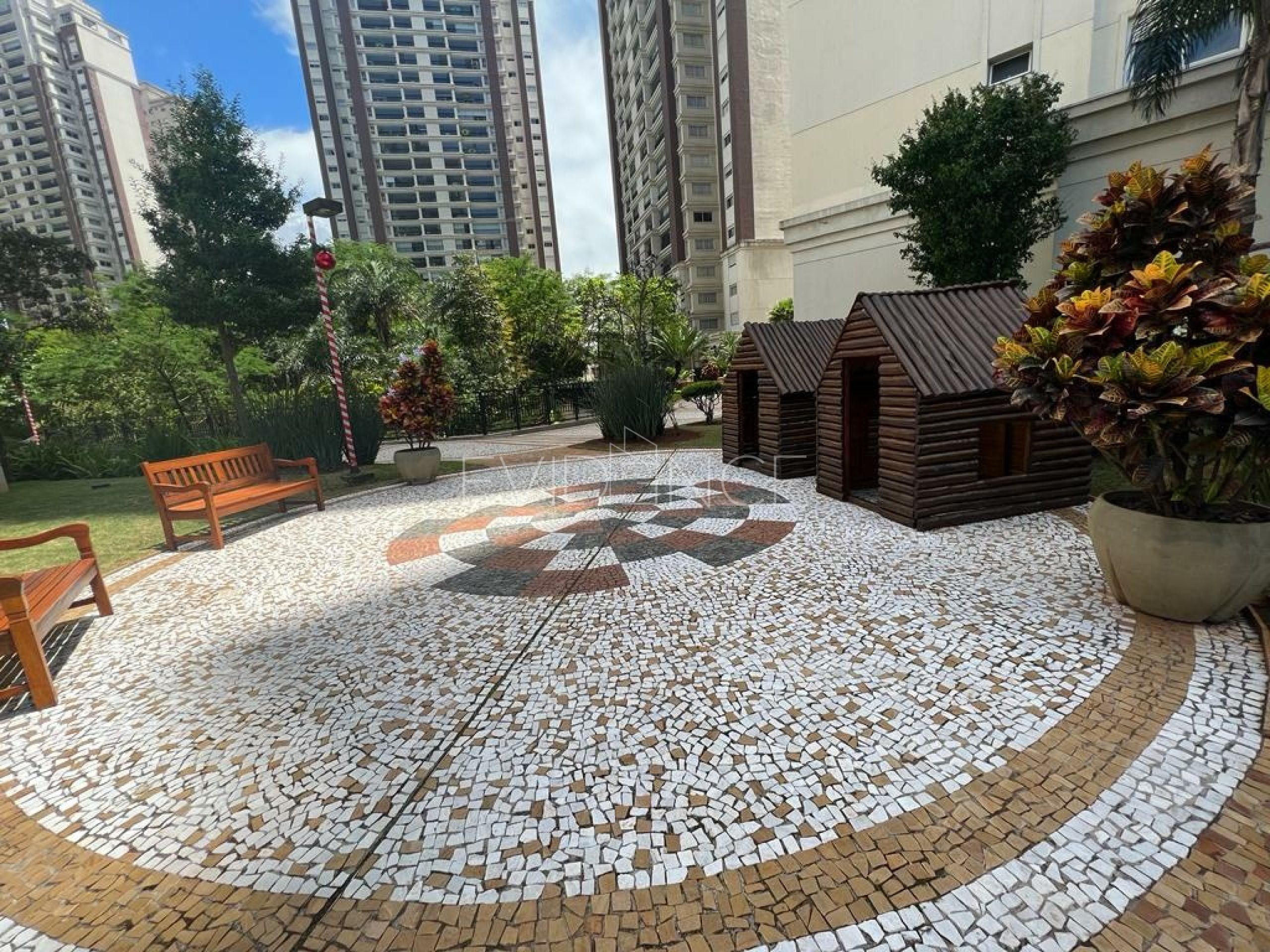 Playground interativo com casinhas, jogo de xadrez, escalada, etc.