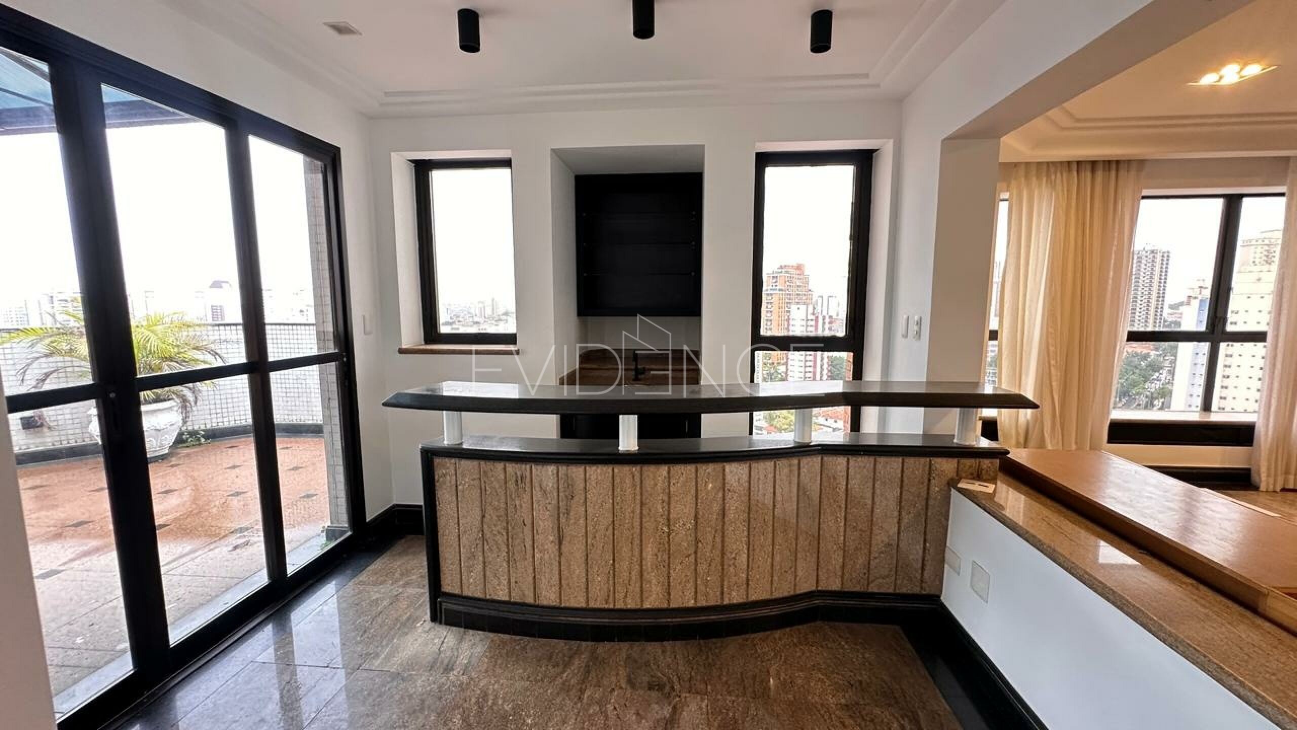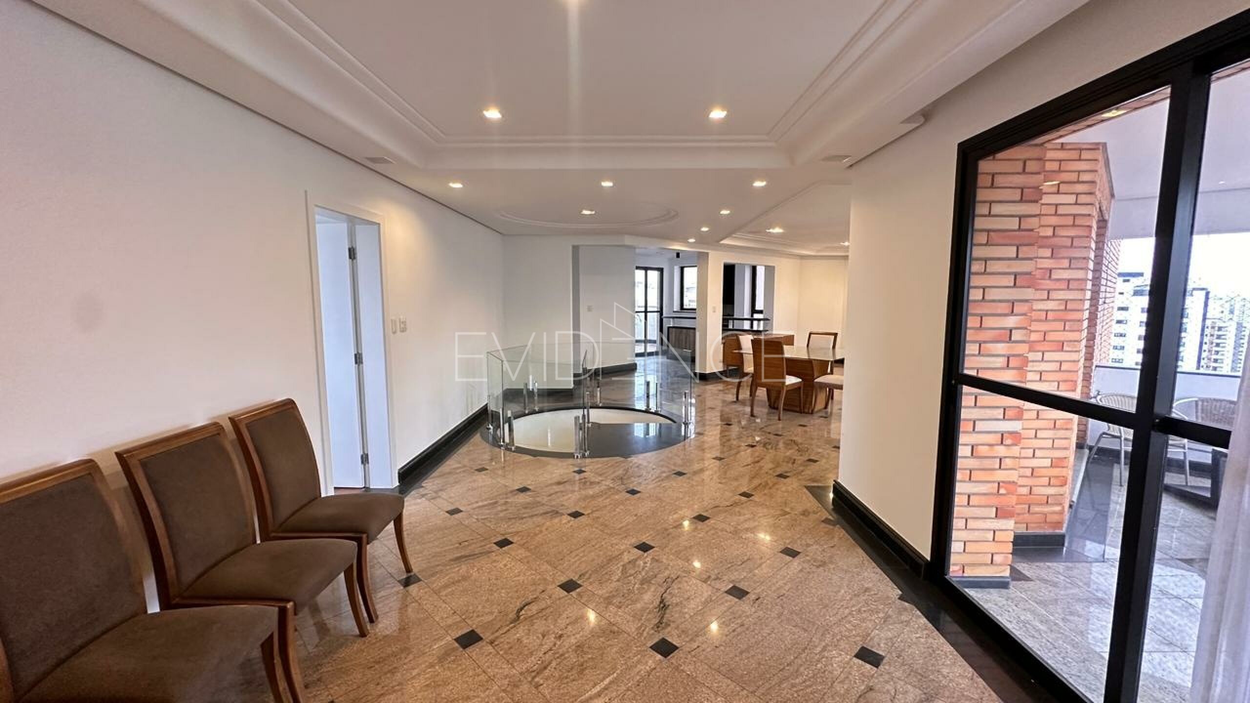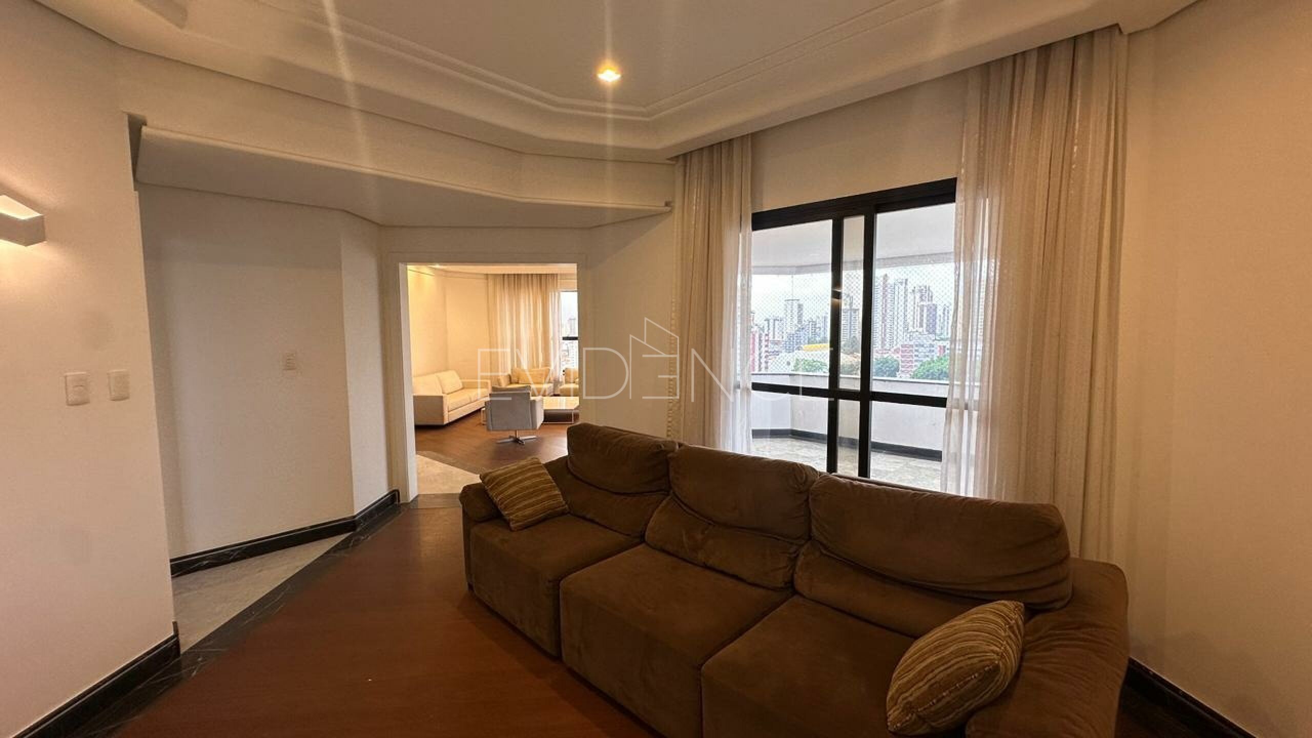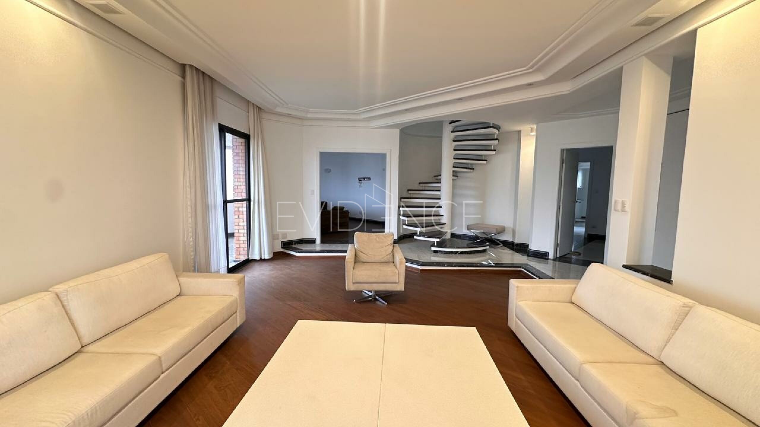 No pavimento inferior, a cobertura conta com quatro suítes amplas, bem distribuídas, proporcionando conforto e privacidade aos moradores. A área social dispõe de cinco salas integradas, com excelente circulação e iluminação natural, além de sacada, que valoriza a vista e amplia a sensação de espaço. O imóvel é semi mobiliado, com acabamentos de qualidade e ambientes planejados.