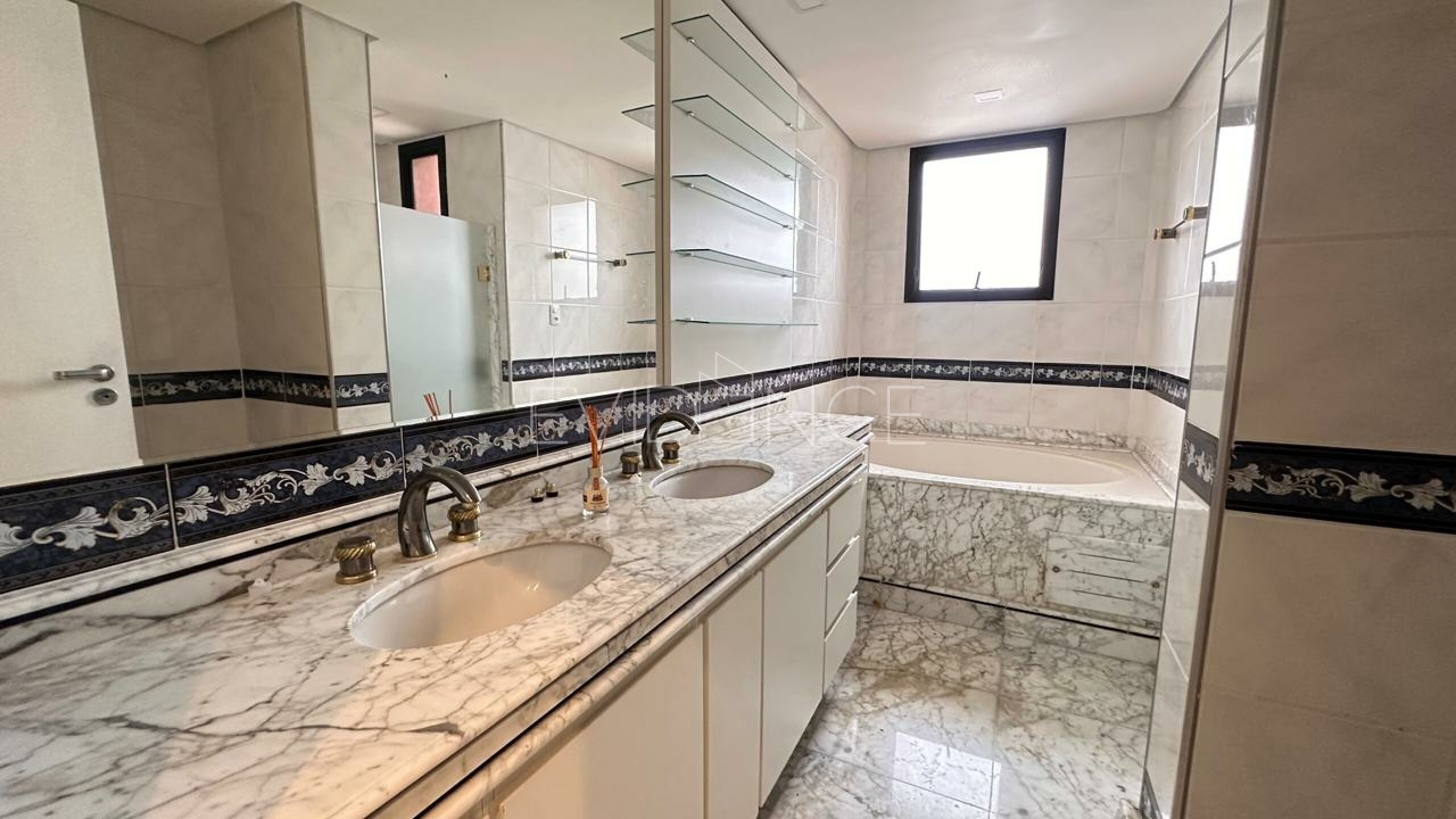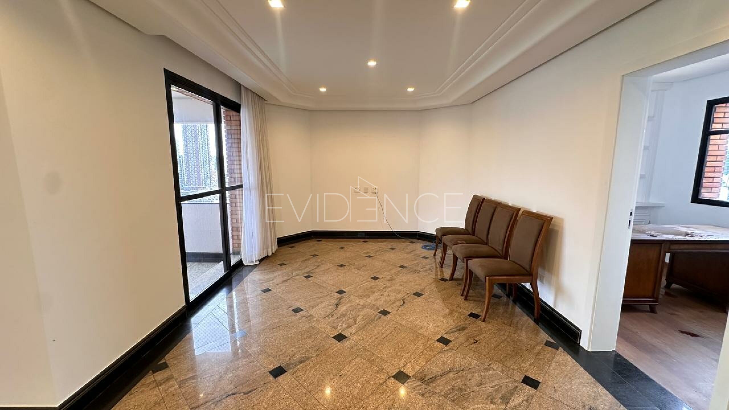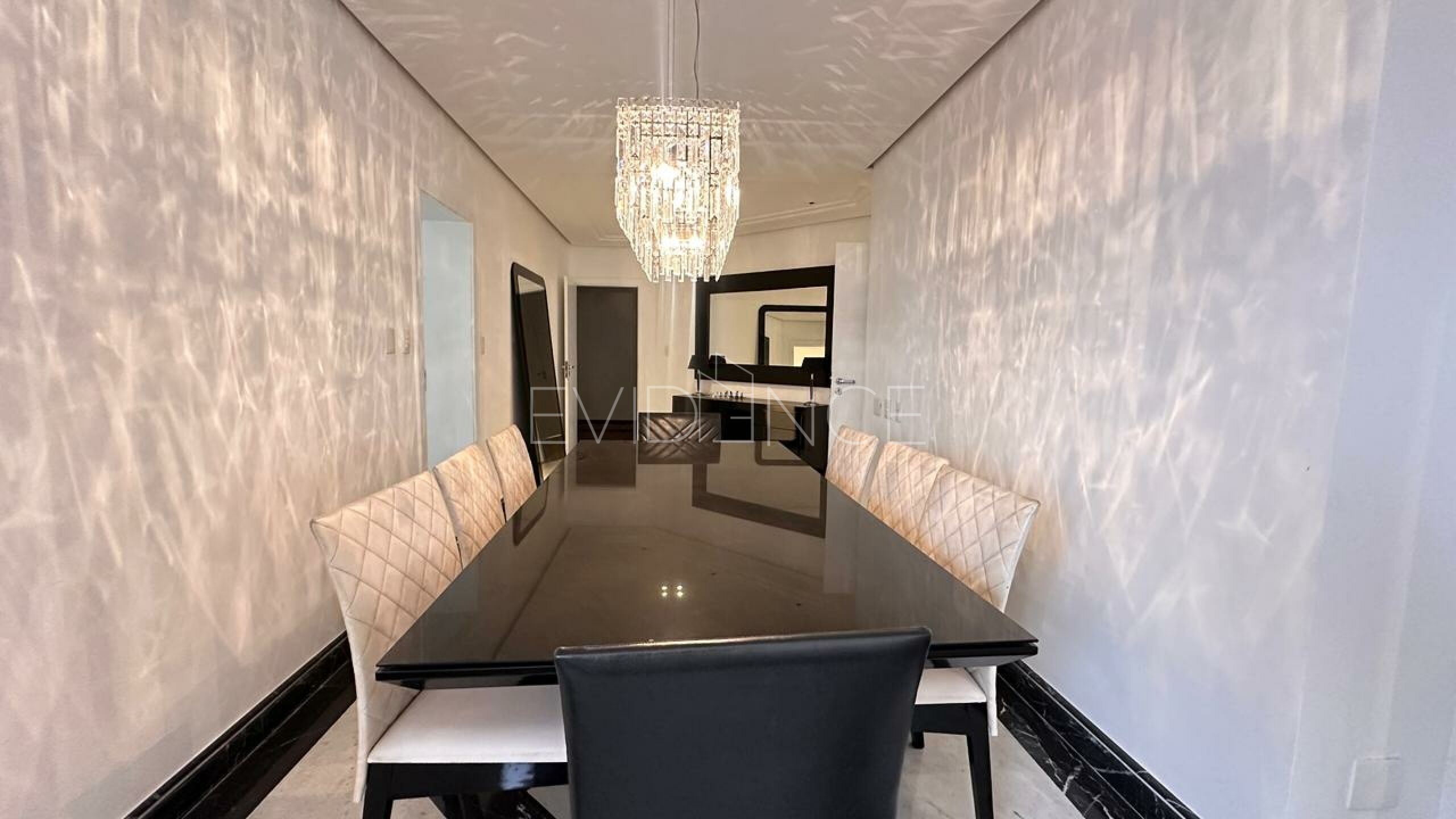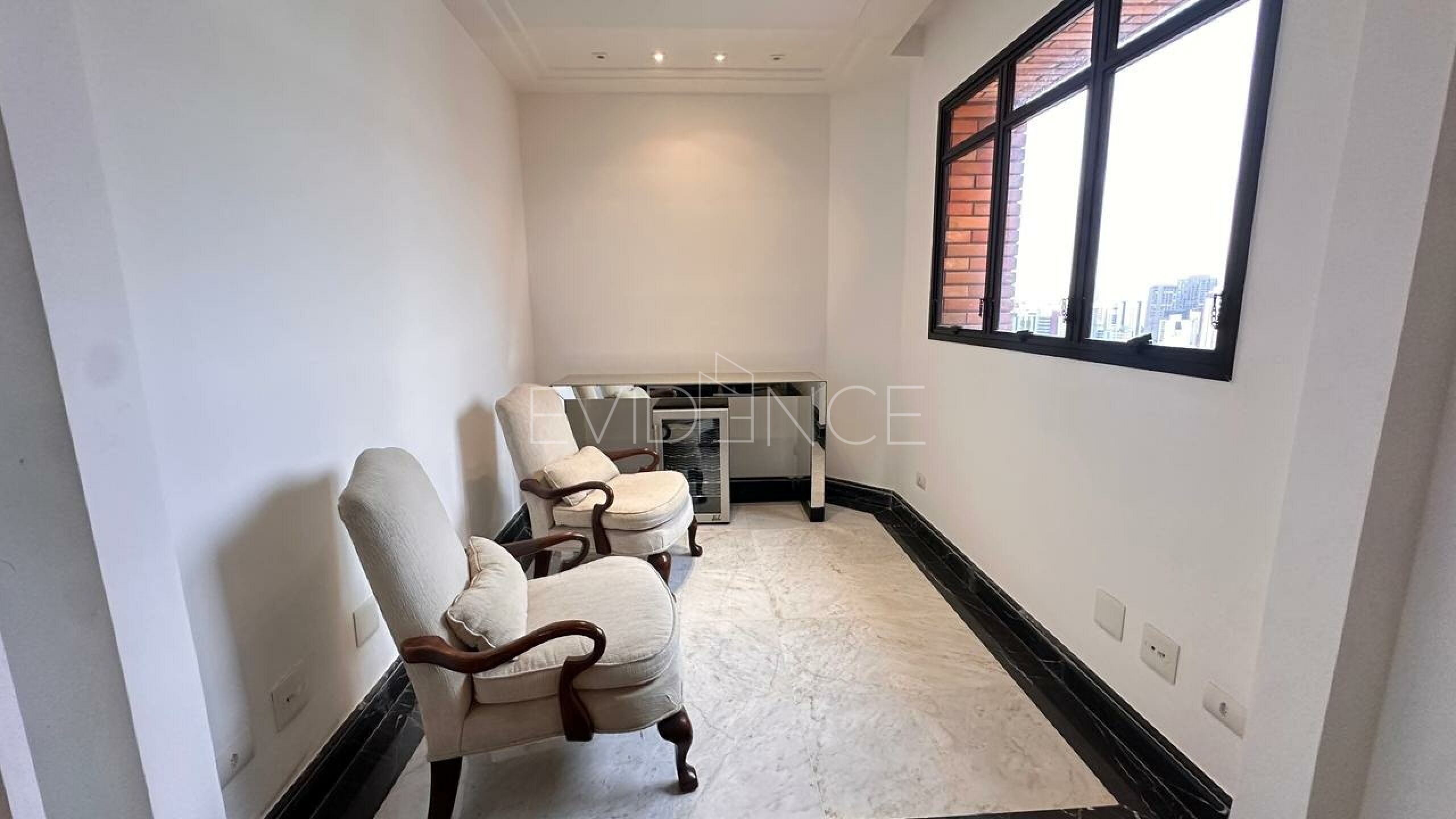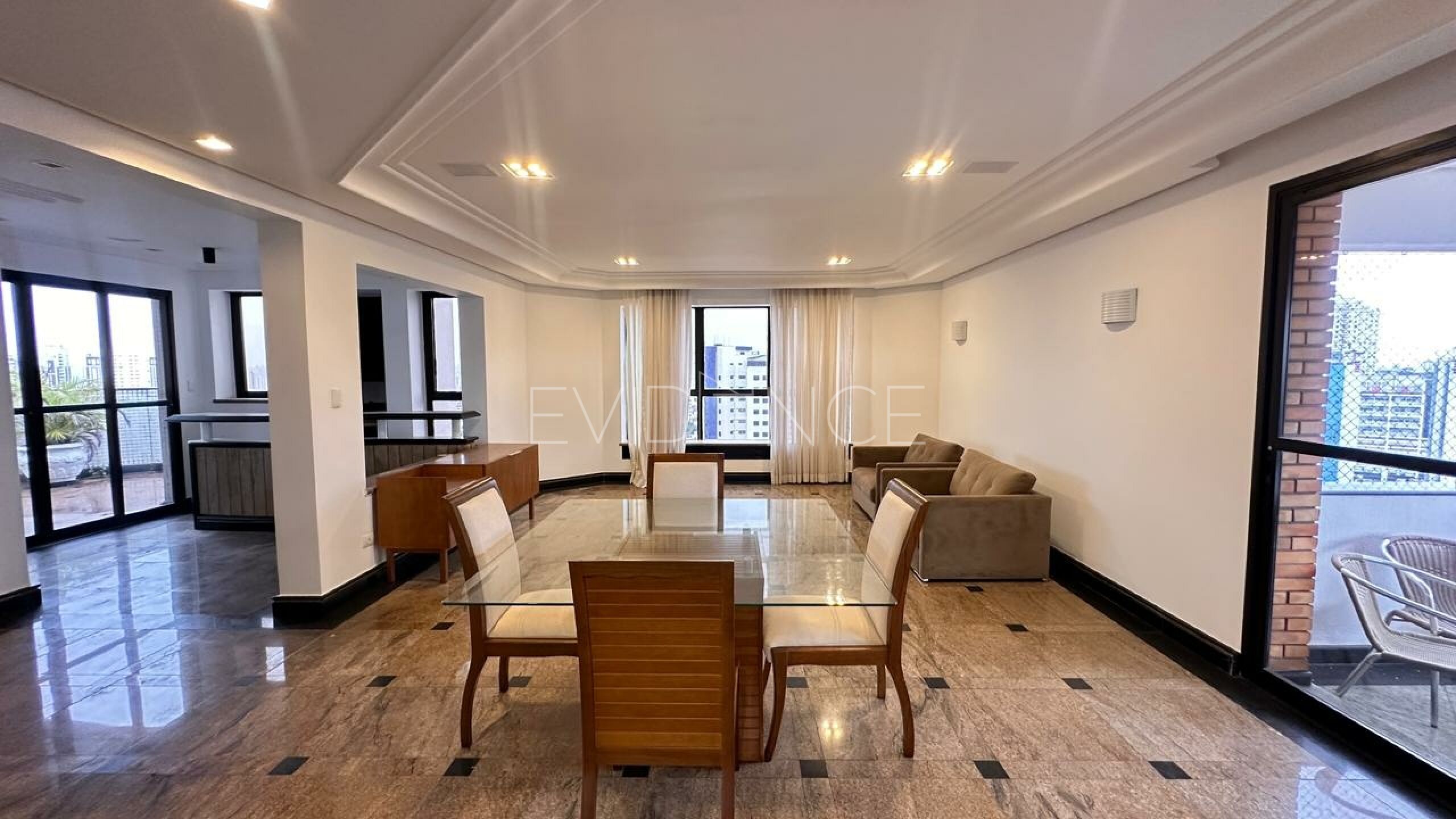 No pavimento inferior, a cobertura conta com quatro suítes amplas, bem distribuídas, proporcionando conforto e privacidade aos moradores. A área social dispõe de cinco salas integradas, com excelente circulação e iluminação natural, além de sacada, que valoriza a vista e amplia a sensação de espaço. O imóvel é semi mobiliado, com acabamentos de qualidade e ambientes planejados.